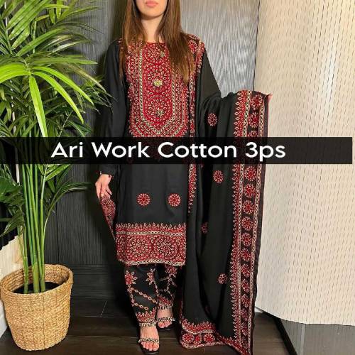 Stuff Lwan Cotton Embroidery Trouser with chiffon embroidery duppta 3Pcs Dress